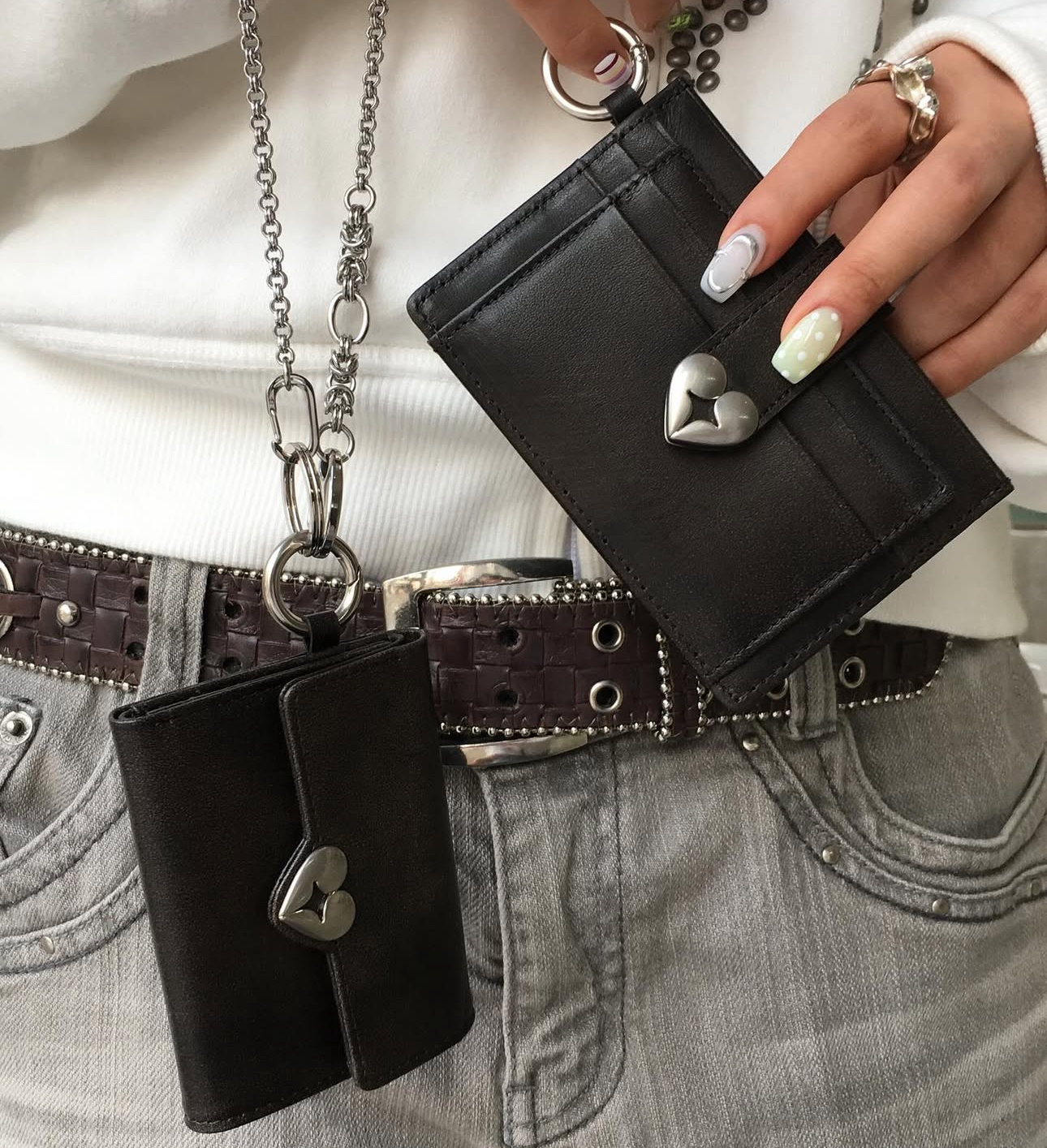 - 皺紋紋理牛皮,表面光滑 - 寬版型與多重記憶卡袋 - 可容納照片卡和身分證的透明PVC隔層和心形標誌裝飾是亮點。 - 6 個卡槽,1 個透明卡槽,1 個拉鍊隔層