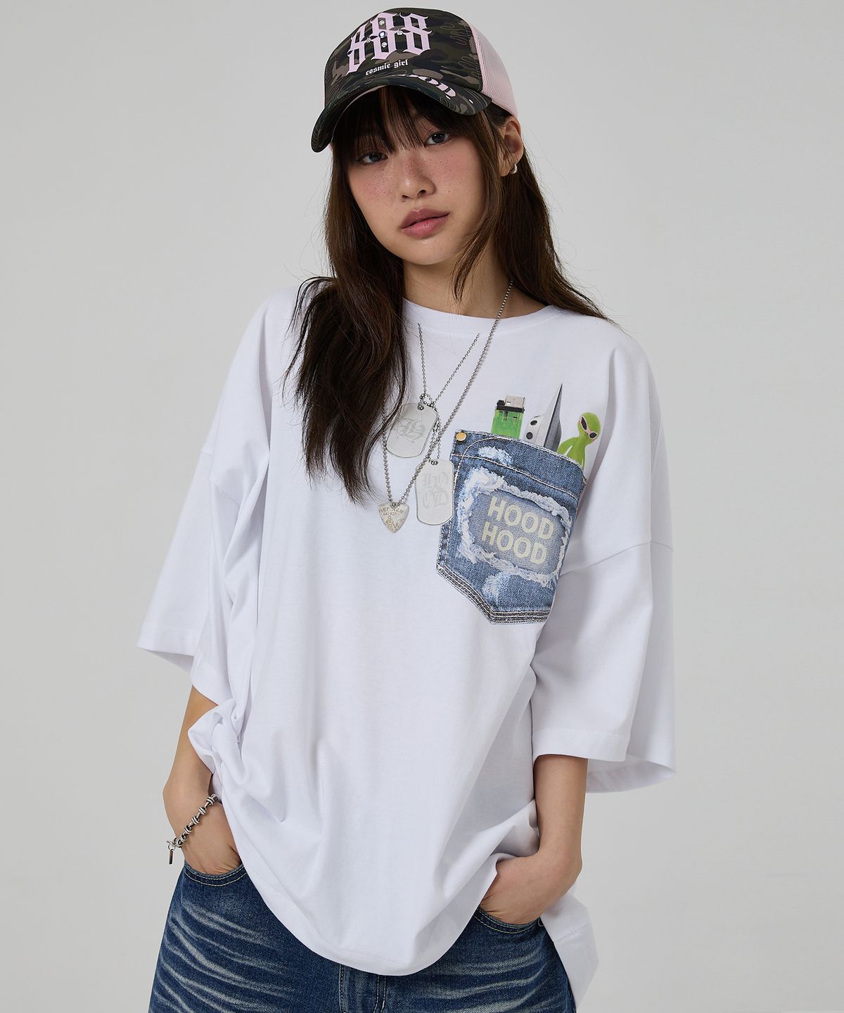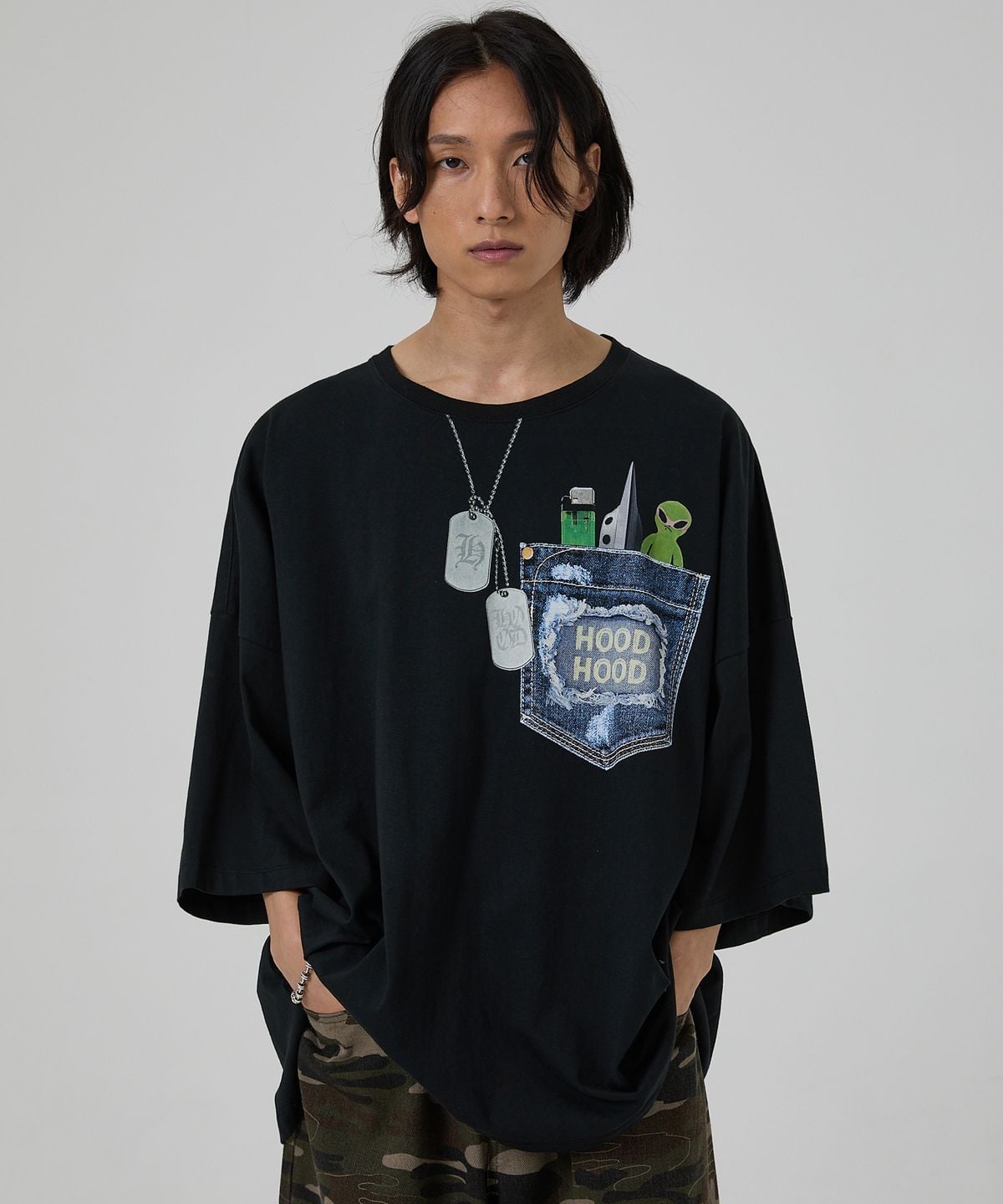 ๐ฐ๐ท่จ่ณผ๏ฝHOODHOOD๏ฝFAKE graphic overfit short-sleeved t-shirt 2่ฒ