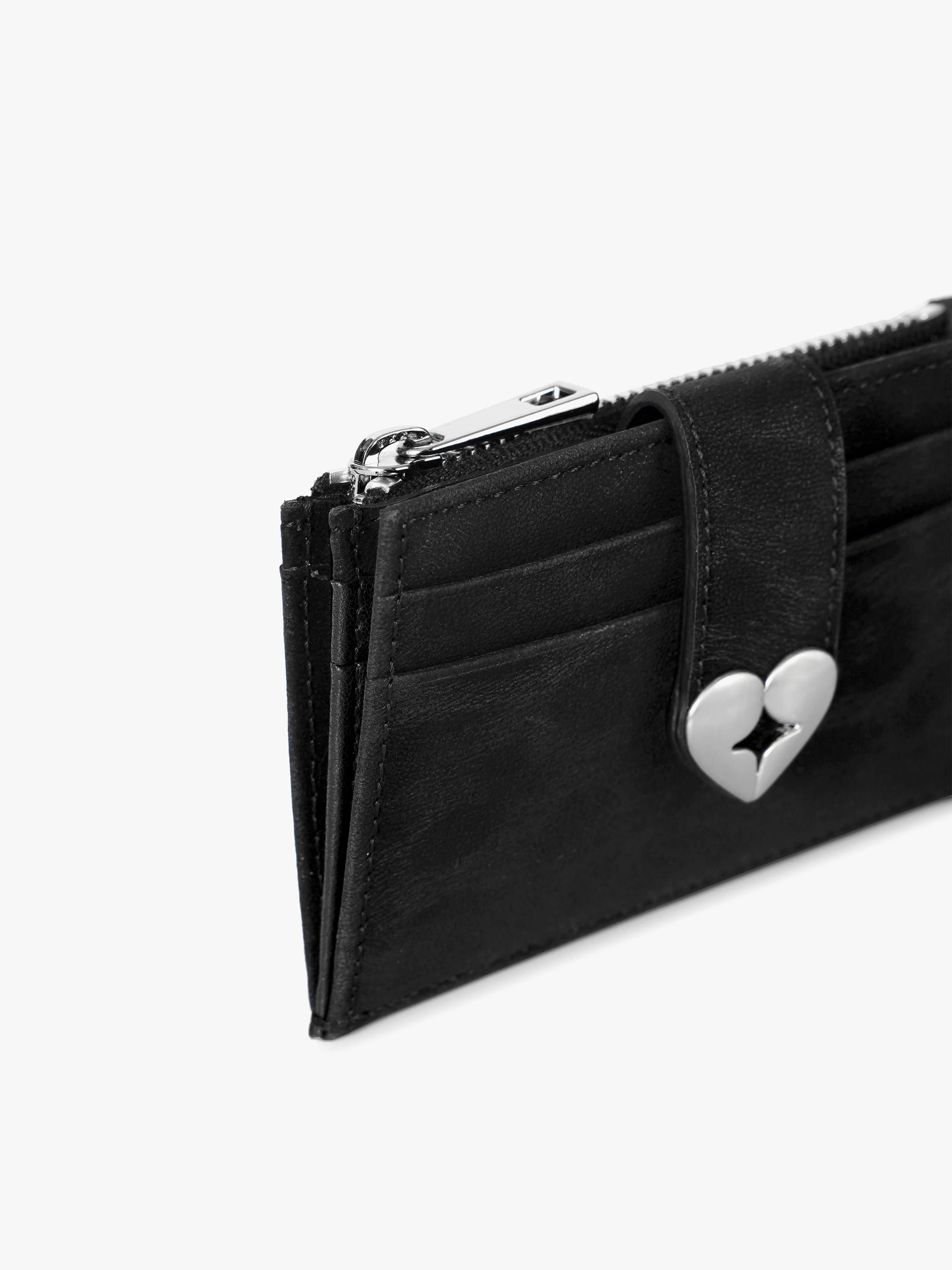 - HEARTY BRIDGE POCKET 迷你版 - 皺紋紋理牛皮,表面光滑 - 實用設計,配有透明 PVC 隔層,可放置照片卡和身分證,以及拉鍊硬幣隔層 - 心形標誌裝飾是重點 - 5 個卡槽、1 個透明卡槽、1 個拉鍊隔層